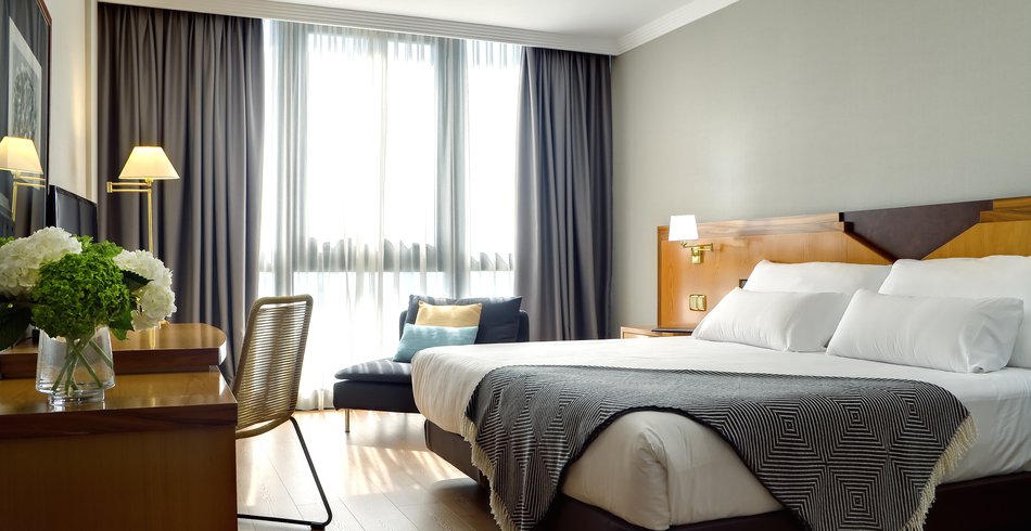 Double room with one double bed or two single beds and an extra bed for a child. Views to the swimming pool or to the city. Private bathroom, hairdryer, heating, air conditioning, telephone, TV, music, minibar and free Wi-Fi connection. Approx. 30 m²