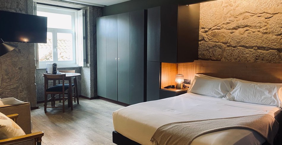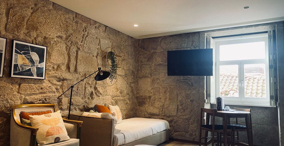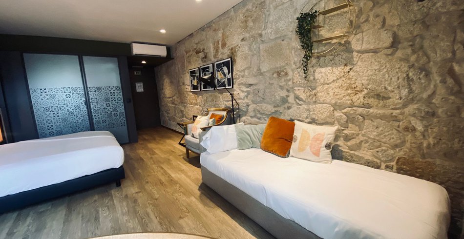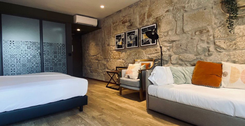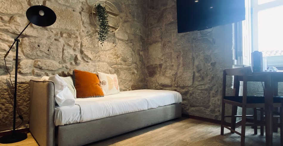 The Oca Ribeira do Porto family studios, with capacity for up to 4 people, have a kitchen and bathroom with shower. They are equipped with basic kitchen utensils, private bathroom with free toiletries, Wi-Fi, air conditioning and television.